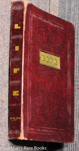 NY At the University Press 1936 1st Hardcover Very Good with no dust jacket color; The first 6 issues of Life Magazine. In vg condition held in a spring back binder by steel rods. Plum colored patterned publisher's binder. These are not bound in but retained their original identities along with covers. ; 8