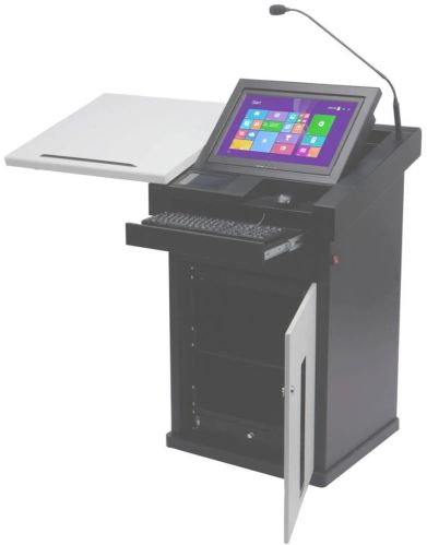 Contact SupplierSaatvik Electronic Lectern or Digital Podium design in MDF with Deco Paint finish wooden podium with lockable caster wheel, Motorized tiltable monitor facility, Space for CPU, Keyboard & mouse, laptop tray, with inbuilt 120 watt amplifier, Two wall speaker, One Gooseneck Microphone, One wireless Handheld Microphone, One wireless collar microphone, Thin Client CPU-i3 processor, 2GB RAM, 1TB HDD, wifi, Bluetooth, Wired Keyboard & mouse, AV connectivity– VGA, HDMI, USB, Aux, RJ45 Power socket, VGA switcher, 21.5” Touch Screen Monitor Monitor Size: 26” X 22” X 47”, Wt: 50 Kg and Optional Items: Visualizer(Document Camera), Projector, UPS, speaker, etc. used for auditoriums, schools, institutions, colleges, universities, church, conference rooms…