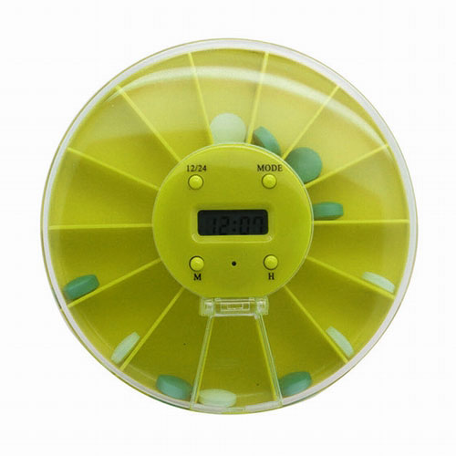We offer Electronic Pill Boxes with alarm. 14 compartments can hold two weeks pills, capsules, and tablets. weeks display, you can differentiate every day's medicine easily can set 5 groups alarm to remind you take medicine on set time in one day time display (1224 model for selection) count-down function (99 minutes, 59 seconds) many colors for choice and large area for logo imprint small size for carry, product size: 9.8 (diameter) x 1.8cm.
