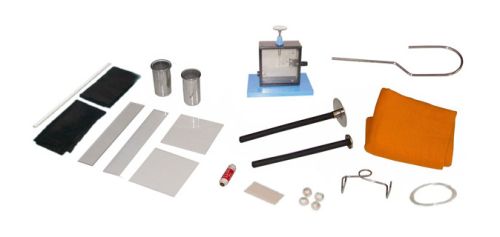 The kit is used for demonstrating a number of electrostatics experiments. It consists of various elements and a gold leaf electroscope with a transparent front window and ground glass rear window.
