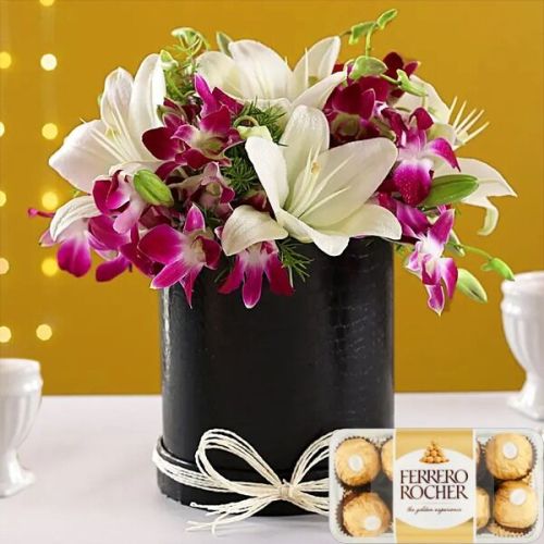 Contact SupplierThe Floral Arrangement includes a mix of elegant white lilies and vibrant purple orchids, creating a striking contrast. Accompanying the floral arrangement is a small box of Ferrero Rocher chocolates, positioned in the bottom right corner, adding a touch of indulgence to the gift. The flowers symbolize purity, love, and elegance, making them ideal for a wide range of occasions like birthdays, anniversaries, or congratulations. It’s perfect for anyone who appreciates the combination of aesthetic beauty and sweet treats, making it a wonderful choice for special celebrations or as a gesture of appreciation.