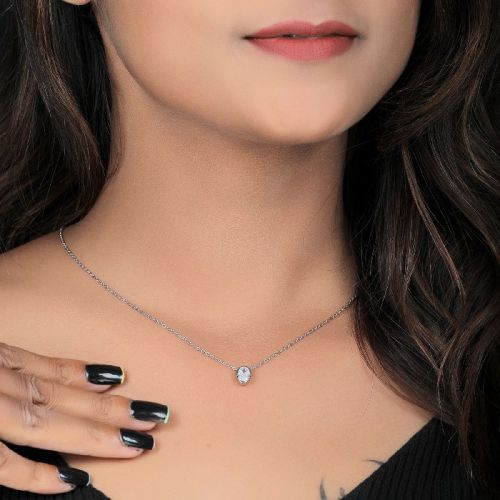 Elegant Oval Solitaire Pendent to Look Classy Metal : Sterling SilverPurity : 925 SilverNeck less Type : Flexible FitChain Length : 19 inchesMetal Color : SilverOccasion : EverydayDiamond Quality : AAA+Package Includes: Chain + Pendent + Box + Care Instruction Card