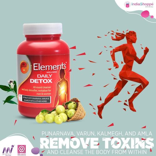 Contact SupplierToday 's lifestyle of increased stress, improper diet and sleep as well as consumption of unhealthy food leads to a build-up of toxins in various organs in the body and impacts body 's resistance. Elements Wellness DAILY DETOX has been designed to improve metabolism, reduce toxins and help eliminate toxins, thereby building body 's resistance. Functional, digestive and excretory system performance are important to maintaining health and age healthily. ELEMENTS DAILY DETOX helps in this process by providing detoxification on a daily basis.
