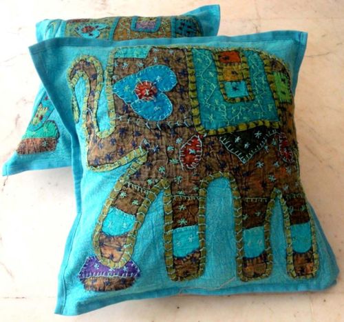 a pair of indian handcrafted applique patchwork embroidered traditional elephant throw pillow cases toss cushion covers. If you are fashion savvy, want to be unique, different and set a trend, these are definitely for you. Spruce up your room with this spectacular masterpiece of work. A look at them makes us realize the painstaking & laborious work involved, not to mention days that one piece takes. This pair is guaranteed to bring you lots of compliments and is truly a bohemian crazy, conversational piece of accessory that everyone's room needs.