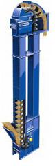 Bucket elevators are designed to move flowing powders or bulk solids vertically. The typical elevator consists of a series of buckets mounted on a chain or belt operating over a sprocket or pulley. Take-ups are provided as a means to compensate for variations in length of chain or belt due to temperature changes, atmospheric conditions, or wear. A steel casing encloses the bucket line. Head sections and boot sections house integral transmission components.
