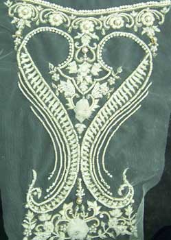 Silk threads of different colors have been used to make floral designs which are embellished with sequins and beads. The excellent color combination and the intricate work of sequins and beads make it an excellent choice for the wedding gown. Further the space between the flowers has been studded with colored sequins to offer the fabric a stunning look.