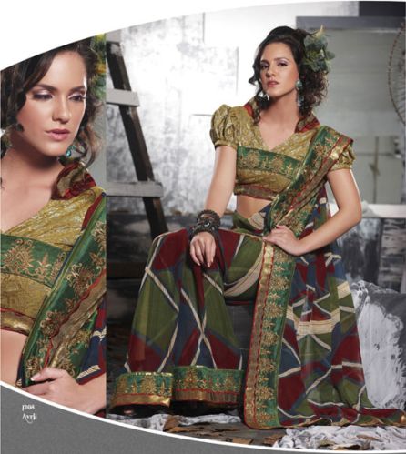 Deep olive green, navy blue and maroon faux georgette saree; It is exclusively embellished with abstarct print, resham and patch work; Gracious patch patti is giving it beautiful and trendy look; Comes with a matching blouse pc.
