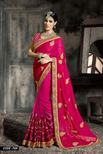 Classical magenta georgette on net designer saree, with resham work, patch boarder work, diamond work, zari work.Bigger sizes are possible but depends on the product.