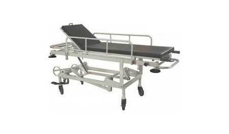 Description : Two section top Height adjusted by foot operated imported hydraulic pump from 660 mm to 910 mm Gas spring assisted Trendelenburg/Reverse Trendelenburg positions Complete with corner buffers, synthetic rubber covered handles, sliding X-ray cassette, accessories tray, oxygen cylinder holder, SS telescopic IV rod and swing away SS side rails Pretreated and powder coated Four imported swivel castors, 15cms dia, two with total lock X-ray Permeable removable stretcher, backrest raised on ratchet Overall approx size: 210L x 65W x