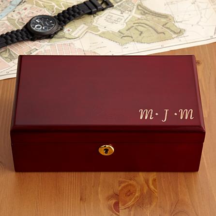 Our cherrywood stained, solid wood Valet Box is perfect for a bureau or credenza to hold his jewelry, wallet or loose change. Measures 9"Wx5"Lx3-12"H. Complete with privacy lock and key. We engrave any three initials in elegant lettering. Item