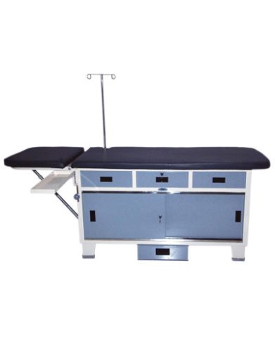 Medical Examination Couch With Gas Spring Made of 18G CRC sheet construction. 3 No’s pull drawers, center with lock. 2 No’s lockable sliding doors movement on stainless steel channel. One inner shelf full length for storage. One swivel BP instrument tray. One stainless steel I.V. pole. One special built in step stool recessable. Heavy duty padded top with water resistant vinyl fabric. Epoxy, powder coated finished.
