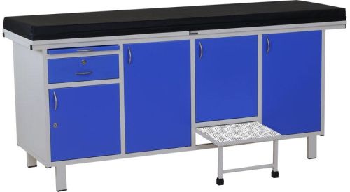 Overall approx. Size : L 1830 mm x W 575 mm x H 850 mm. Frame : CRCA Rectangular Tubes, CRCA sheet cabinets. 100 mm thick reversible foam mattress. Four cabinets - One with lock & one drawer with lock. Â Sliding stepping stool & Writing pad. Pre-treated & Epoxy powder coated. Optional : Lock facility for remaining Cabinets.