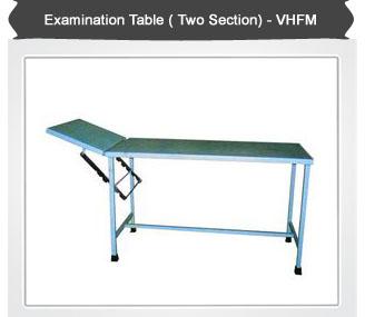 Our precision range of Examination Table (Two- Section) has an ERW tubular pipe frame work of mounted on four heavy duty rubber shoes. These are also provided with provision for fixing saline rod available on both sides and are pretreated and epoxy powder coated.  Technical specifications  Size: 180 L x 50 W x 75 H cms ERW tubular pipe frame work of mounted on four heavy duty rubber shoes M.S. sheet top in two sections with head side adjustable on ratchet Pre- treated and epoxy powder coated