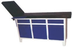 Dimensions: 183(L) x 51(W) x 81(H) cms. M.S. Tubular construction with two section upholstered washable leatherite rexine top, with head section raising on smooth pneumatic mechanism. Fitted with two drawers,two cupboards. Pre-treated powder epoxy finish. Â