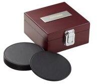 Executive Coaster Box Set includes 6 coasters with UltraHyde tops on non-scratch velvet bottoms in a polished wooden case. Free laser engraving (one position).