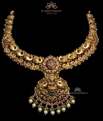 The intricate design features a majestic peacock, graceful elephants, and divine goddess motifs. Vibrant gemstones and delicate pearls enhance its allure. Whether worn at weddings or cultural events, this timeless piece celebrates tradition and elegance. Carry the legacy of craftsmanship with pride.