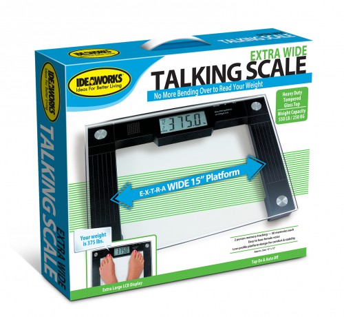 EXTRA WIDE TALKING SCALE 550LB weight capacity. Extra wide, stable weighing platform. Tempered glass top. 2 person memory feature. Large LCD display. No more bending over to see the scale. ID JB5824 BRAND IDW-HNH CASE PACK 4 CASE WEIGHT 27.25 CASE LENGTH 17.2 CASE WIDTH 10.4 CONSUMER PACK 4 COLOR BOX W HANDLE CONSUMER PACK DIMENSIONS 16.25" X 13.98" X 2.32" UPC EAN NUMBER 017874004355