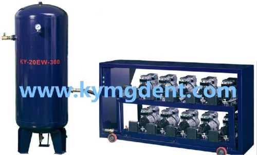 Factory central dental air compressor Voltage: 220V 50Hz Electric current: 37A Power: 8400W Frequency: 1050Lmin Start pressure: 0.5 Mpa Capacity pressure: 0.8 Mpa Air tank volume: 300L Noise: 88-90dB G.W: 308kgs Main unit size: 166x45x87cm Air tank size: