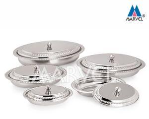 Fancy oval dish with cover compliments casual or formal banquet applications and is ideal for catered events. Serve fruits or appetizers, hors d’ oeuvres, or signature entrees, a stainless steel serving tray will enhance the overall presentation of the dish. Available sizes: 25, 29, 33, 39, 44 cm