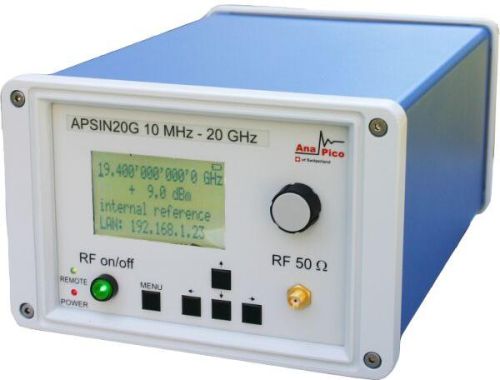 The APSIN20G is a low-noise and fast-switching microwave signal generator covering a frequency range from 100 kHz up to 20 GHz+. The lowest settable frequency is however as low as 100 kHz with some reduced maximum output power. The APSIN20G a wide and accurately levelled output power range and high spurious uppression. Advanced frequency synthesis with fractional-N divider makes for low SSB phase noise and micro-Hz frequency resolution.