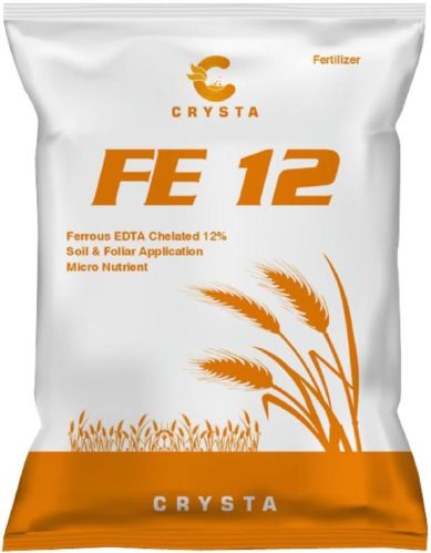 FE 12 EDTA is the source of Iron. Iron is a micronutrient required for plant growth; without it, disorders like iron chlorosis occur, resulting in a reduction in yields. FE 12 Edta contains 12% Fe and In this product, the Ferrous is chelated by a chelating agent EDTA (Ethylene diamine tetra acetic acid). The product is recommended for soil application as well as a foliar application. This product is widely used to correct or prevent iron deficiencies and iron colorists and it is recommended for soil pH ranging from 4 to 8.