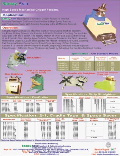 Samay-asia are largest mfg in press shop & stripcoil automation machine like, feeders, pneumatic feeder, air feeders, roll feeds, gear change feeder, coil feeders, nc servo feeders, sheet feeder, press feeder, pneumatic strip feeder, punching press feeders, precision pneumaticair feeders, decoiler, un-coilers, reel stand, twin decoilers, heavy duty decoilers, strip straighteners, 2in1 coiler with straighteners, 3in1 & 4in1 compact feeding unit, coilsheet feeding line, low cost press automation,cut to length machine and many more.......