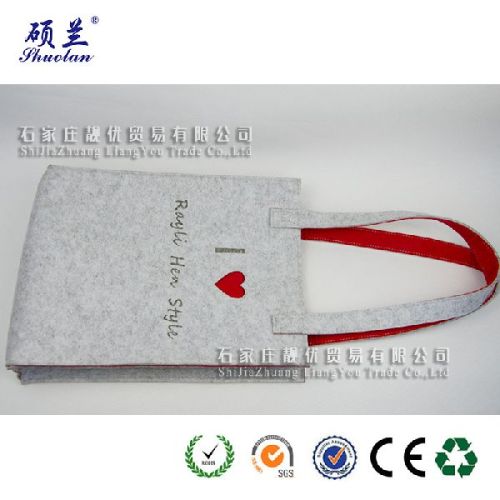 Contact SupplierCustomized design felt tote bag shoulder bag This felt leisure bag is suitable for shopping or party, and it can hold a lot of things, such as cosmetics, snacks and so on.The surface of the bag has a heart-shaped design, which is stylish and cute. The straps are long and easy to carry.We also supply the feltbag,feltstorage basket,felt craft ,felt letter board ,felt materialand so on. Item Name Customized design felt tote bag shoulder bag Size   30*7.5*37.5cm or customized Material 100% polyester felt Color Customized Printing As per customer require Logo As per customer require Thickness 1-6mm Certifications CE,AZO free,Formaldehyde Free,Phthalate Free,Lead free Usage gift, prize,business,shopping, traveling, outdoor ect. Feature Reusable, eco-friendly Customized OEM & ODM are welcomed Sample avaliable Sample Date 5-7 days MOQ 500pcs Payment TT,LC,DA,DP,West Union,Paypal and so on Delivery port FOB Shanghai Delivery Time About 10 -15 Days after Your Deposit and Counter Sample Approval, Depends on the Quantity.