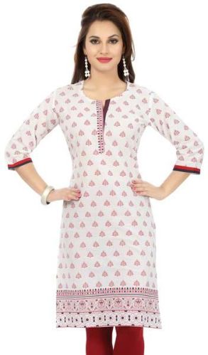 Contact SupplierA light shade comfortable fabric loaded with red colored small motifs placed sparsely, in an elegant manner is what this tunic from Snehal Creation made up of. The tunic has a round neck and a slim neck panel that is visible distinctly. A triple layered printed border lines the tunic at the base along with double colored taping which also decks it around its three quarter sleeves.