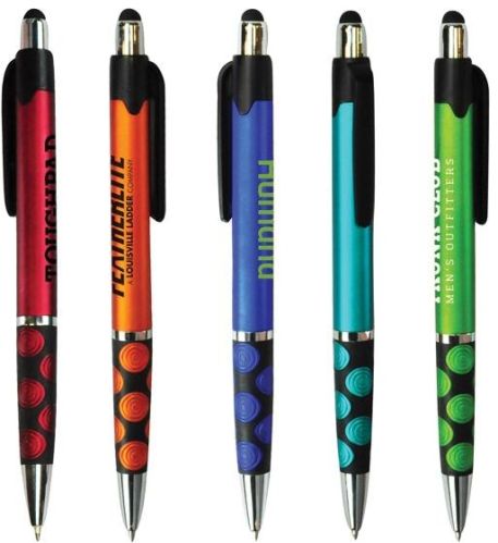 Write a new campaign with the help of this festival stylus pen! Our exclusive product, this unique plastic metallic colored pen features a chrome tip and plunger, a stylish grip and a stylus on top of the plunger. Write in beautiful smooth medium blank ink on paper and then on a touch screen with the stylus end. It's a practical giveaway at banks, tradeshows and conventions. The set-up charge is free and it's always available. Don't forget to imprint your custom logo or company name on the pen to impress all of your clients!