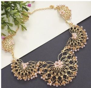 Contact SupplierThis elegant statement necklace is a stunning blend of intricate design and delicate detail. The piece features a series of filigree flower motifs, meticulously crafted from gold-toned metal to create a beautiful, lace-like pattern. Each bloom is adorned with a cluster of dainty pearls, adding a touch of classic sophistication and soft texture. The adjustable chain ensures a perfect fit, allowing the necklace to sit gracefully along your collarbone. Perfect for adding a touch of artistic flair to a simple dress or for complementing a formal outfit, this necklace is sure to be a conversation starter.