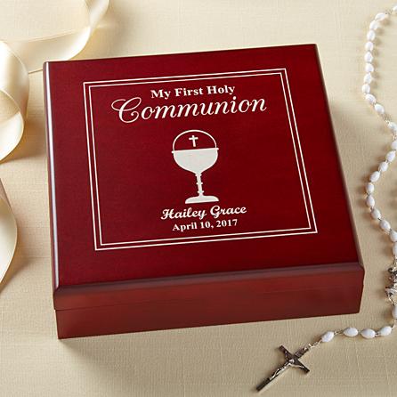 A Personal Creations Exclusive! Their First Communion means so much, and this keepsake box will commemorate the day forever. It provides a special place for their rosaries, jewelry, prayer cards and other gifts. Crafted of natural wood with a cherry finish. Includes a hinged cover. Personalize with any message up to 2 lines: first line up to 25 characters and second line up to 30 characters. "My First Holy Communion" will always appear. Measures 2"Hx6-34" sq. Item