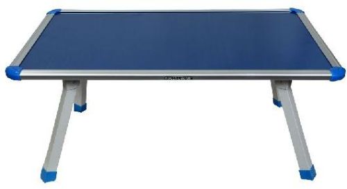 ROGER & MORIS COLOURED FIXED BED TABLE WITH CROSSED METAL LEGS (BLUE TOP)  Coloured Fixed Bed Table With Crossed Metal Legs (Blue Top) - Top surface is attractive laminate suface in blue colour with anodized aluminium framing  (Dimension - 25 inch x 13 inch approximately). Top is fixed at bottom with powder coated metal legs. Height of table is 10 inch (approximately) when opened. It ideally suits as bed study table and also as snacks table.