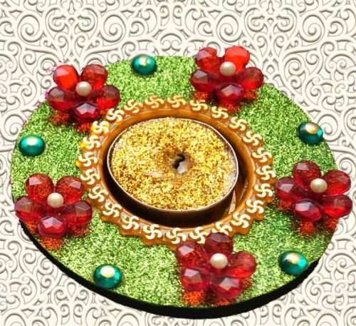 This is a beautifully crafted designer floating Diya looks like lightening lotus in water. It is manufactured from qualitative range of raw materials. Here Beautiful coloured crystal flowers, stones and different colour glitters are used that looks like a beautiful garden of flowers. This is a multi-coloured floating diya for giving more traditional festive look to your home. When it is lighten, it will enlighten each and every moment of the festive season.
