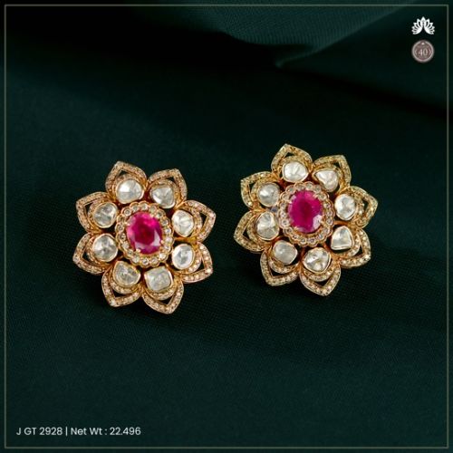 These stunning floral earrings feature a brilliant oval ruby at the heart, encircled by sparkling polki diamonds, all set in a rich gold base. A perfect fusion of classic beauty and contemporary charm, these earrings are sure to elevate your look.