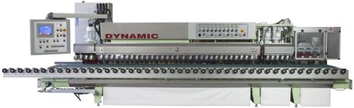 The machine is equipped with an inout and updown adjustable calibrator which has a 5,5 hp motor. The standard version has 5 frontal polishing heads and 2 chamfer units. (4 in the flotter 540). All polishing heads and chamfer units have independent regulation of the air pressure. It is also fitted with a 5,5hp universal saw for upper, lower and inclined cutting.
