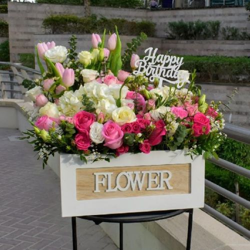 An elegant flower arrangement of mixed flowers in a wooden basket. Picture: Large Small: 25 x 14 cm Medium: 30 x 18 cm Large: 25 x 23 cm Note: Flowers and container may vary depending upon the availability. Acrylic Happy Birthday NOT included. Occasion: anniversary, birthday, love & romance, wedding ceremony, get well soon, new born baby, I am sorry, thank you, just because Â