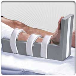 A polyurethane foam pillow that affords excellent positioning with the exacting attention. Comfortable foam straps securely hold the leg and are Velcro® compatible. The adhesive strip on the footplate allows secure attachment to a footboard for additional protection. Point, click and order on line.