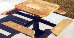 This single pedestal table has a main support of 4" square tubing with seat and supports made of 3" square tubing. The top is 38" square. Choice of pressure treated Southern yellow pine, aluminum or recycled plastic.