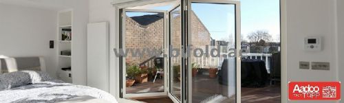 Framed Folding Doors  is an aluminum framed system in Dubai United Arab Emirates where doors are united with hinges and top mechanism so as pulling the first door will lead the others together. The doors are applied into track rail which is fixed on top and slide using special rollers that provide smooth and quiet movement. No further use of extra floor necessary, while door track rail is stability is achieved with the use of either safely locks or floor lathes