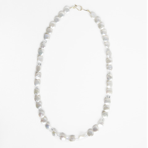 Freshwater Pearl Coin Necklace Freshwater pearl chain necklace. Swarovski crystals. Gold hook & eye clasp. 19″ long.
