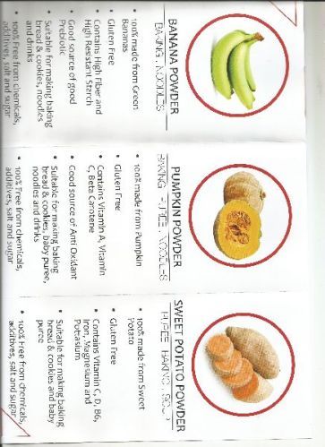 Banana Powder for baking, noodles Pumpkin powder for baking, puree, noodles Sweet potato for puree, baking and soup carrot powder for soup,baking and puree 100% made from fresh fruit contains Vitamens various vitamins gluten free 100% free from chemicals, additives, salt and sugar