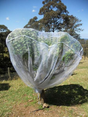Fitted fruit tree net, designed to stop birds, bats, fruit fly and other pests from eating your fruit. This is an exclusion product, no chemicals are required. Mesh is 2mm x 2mm, UV treated , woven polyethylene HDPE .There are 2 sizes. A 2metre cube and a 2.5metre cube.