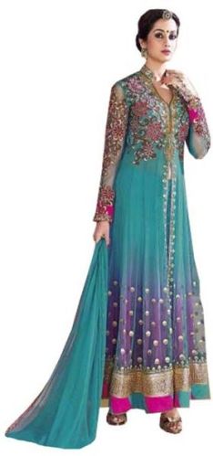 We are offering net top:blue,santoon bottom:blue,net dupatta:blue,inner:rosilk,size:1.90 mtr top,2.25 mtr bottom,2.25 mtr dupatta,pattern:embroidered ,occasion:party wear,dry clean only anarkali type suit.