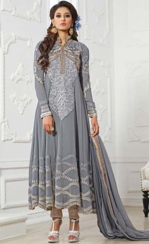 We are offering georgette embroidered anarkali type suit. Georgette top:grey,santoon bottom:grey,georgette dupatta:grey,inner:rosilk,size:1.90 mtr top,2.25 mtr bottom,2.25 mtr dupatta,pattern:embroidered ,occasion:party wear,dry clean only anarkali type suit