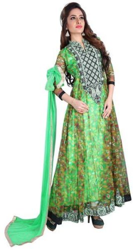 green Georgett top, bottom:no inner:rosilk Dupatta:sofnet 1.90 mtr top, 0 mtr bottom, 2.00 dupatta, work:embrodary work gown occassion:party & wedding, wash care:dry clean