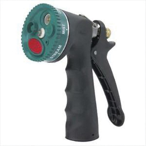 Gilmour® Spray Nozzle, Full Action, Die Cast ZincBrass Hold-open clip for continuous spraying Rust resistant stainless steel spring All brass valve stem with permanent adjusting nut Self-adjusting "duck" packing for lifetime leak proof seal Cushioned vinyl grip handle