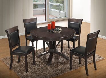 FULTON 5PC DINING SET 323300 Fulton 5pc Dining Set is available in dark Espresso. Solid rubber wood Veneer table top PU seats Dimensions: Table: 48x48x30 Chairs: