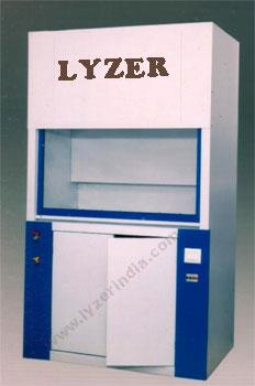 Lyzer Fume Hood cabinet: Fabricated out.of thick c.r.c.a. sheet OR Wooden Board, double chamber, outer triple layer enamel painted and inner finished in apoxy & lined with compressed a asbestos sheet with strong blower exhaust system, light arrangement & counter balanced sliding sash. To work on 220 / 230V AC 50 Hz. Power plug with socket provided.Size- Wdt. Dpt. Ht. Exhaust Duct No. 12201 4' x 2.6'x 31/2'Â Â Â Â Â Â Â Â Â Â Â 3" dia02 5' x 3' x 31/2'Â Â Â Â Â Â Â Â Â Â Â Â 4"03 6' x 3' x 31/2'Â Â Â Â Â Â Â Â Â Â Â Â