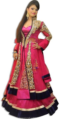 We are offering fuschia embroidered lahenga suit. Beautifully designed fuschia color lahenga with gold zari embroidery and crystals work. The fabrics used are tulle, velvet and satin.