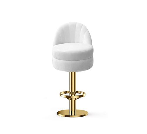Gable bar chair has a shiny round base and a footrest in polished brass, with a fixed height of 1m. It is fully upholstered in cotton velvet and features a super stylish design, with an accent low back and a cylindrical shape. Perfect for residential or hospitality projects.